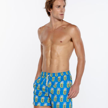 The printed fitted short is in a soft microfibre fabric with a slight surface sheen. For added comfort it has enforced flat seams & has been detailed with a fashionable elastic band for a modern effect. Made in Spain