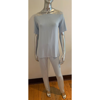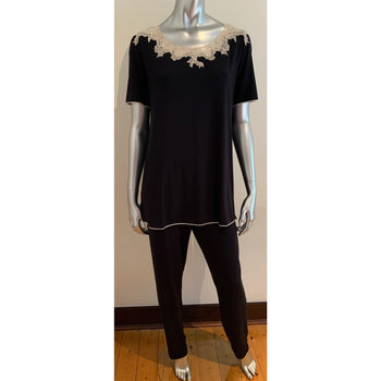 The short sleeve pyjama has long pants in a luxurious knit fabric which is incredibly lightweight & bears ultra softness that is distinctive to this brand. Detailed with an exquisite contrasting lace around the neckline & finished with lustrous stitching on the edges, makes for perfect lounging around in true elegant style. FABRIC: 95% Modal,...