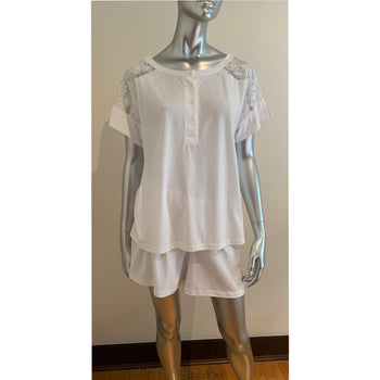 The short sleeve pyjama has short pants in a soft cotton jersey knit whilst combining a delicate exquisite lace for the sleeve. This style has a sense of playfulness with its button front & action back detailing, for a modern yet comfortable approach to sleeping.