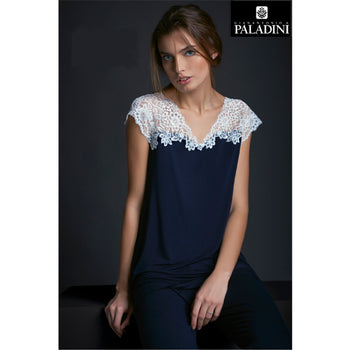 The short sleeve pyjama has long pants in a luxurious knit fabric which is incredibly lightweight & bears ultra softness that is distinctive to this brand. Detailed with an exquisite contrast lace around the neckline & a lustrous contrast stitching for its edge finishes, makes for perfect lounging around in true elegant...