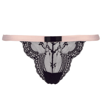 The sexy g-string is in a delicate scalloped lace & has been detailed with a contrasting matt stretch satin. It features a flat soft bow in the centre front for some added boudoir chic.
