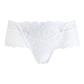 The timeless bikini combines a soft mesh knit fabric with a slight surface sheen & a lustrous plain jersey for the back, which makes it ideal for underneath any fitted garment. It has been detailed with an exquisite contrasting scalloped embroidery & a decorative motif with a delicate ribbon detailing on the...
