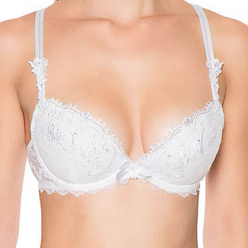 The push up provides extra volume by enhancing a woman's cleavage with its additional micro bead fillers, whilst in a delicate embroidered tulle with scalloped lace detail. It's been adorned with tiny satin bows & gold trinket in between the cups to enhance the beauty & romantic nature of this collection. EMBROIDERY: 55% Polyamide, 36% Polyester,...