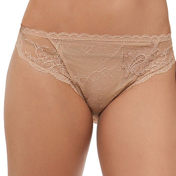 The elegant Brazilian bikini is in an exquisite scalloped lace & has been detailed with a delicate bow to enhance one's femininity. It has a soft jersey laser cut back which makes it ideal for underneath any fitted garment. This collection captures the essence of true Parisian style. SIDE LACE:...