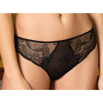 The elegant bikini combines an exquisite lace with the fine embroidered tulle which has a delicate fern design, whilst highlighted with a midnight blue lurex thread. It has a plain soft jersey back with a slight surface sheen & has been detailed with tulle edges, making it ideal for underneath...