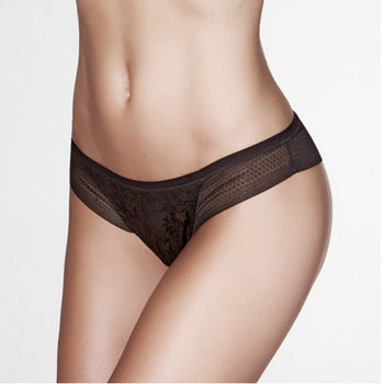 The classic g-string is in a lightweight opaque knit fabric with a slight surface sheen that has laser cut edges to provide a smooth profile for underneath garments. It's been detailed with a couple of decorative motif in the front for some added elegance. FABRIC: 76%...